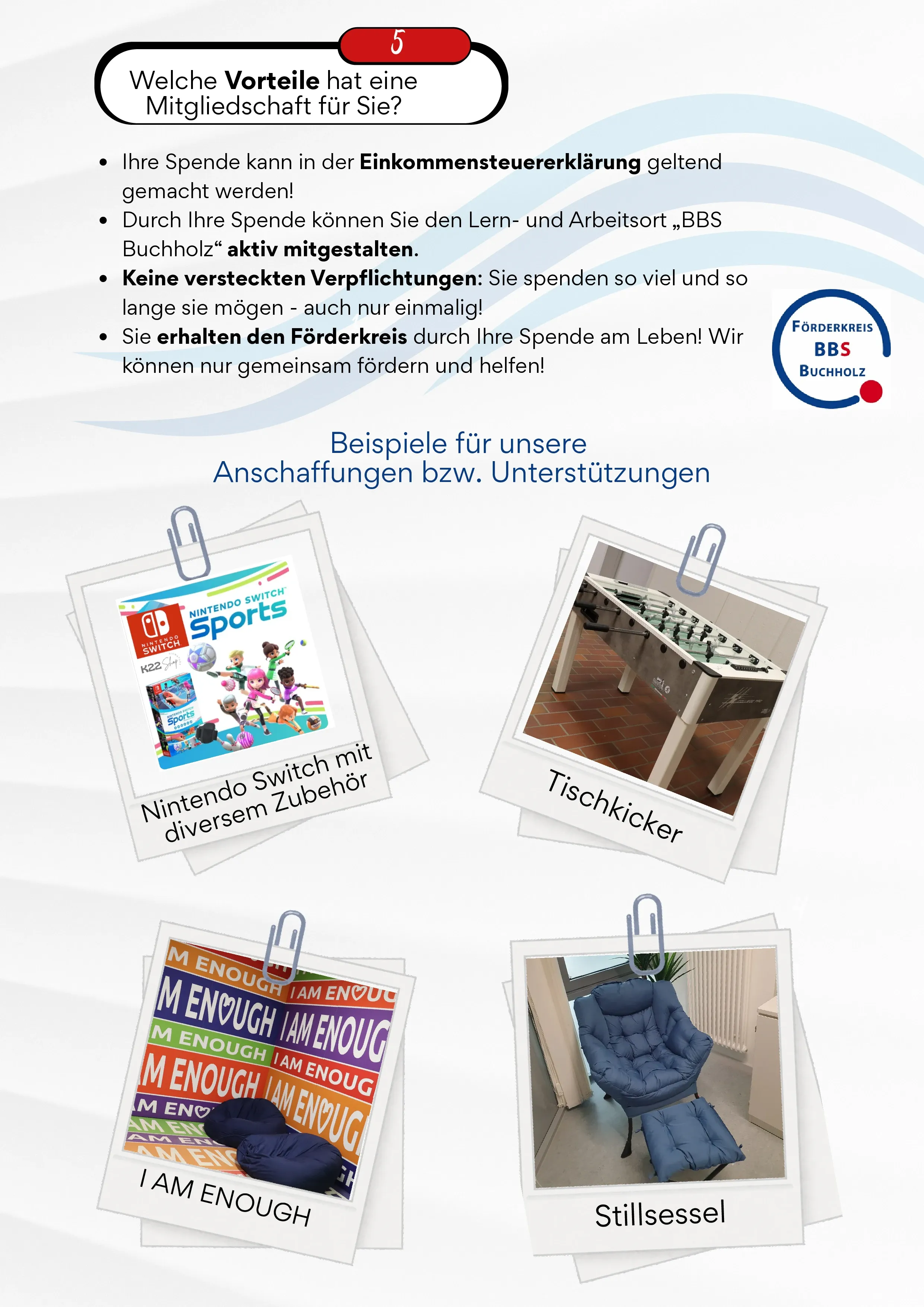 Dank des Förderkreises konnten in der Vergangenheit bereits zahlreiche Anschaffungen realisiert werden, darunter Lern- und Aufenthaltsangebote wie ein Tischkicker, ein Stillsessel oder Materialien zur Stärkung des Wohlbefindens im Schulalltag. Auch Projektideen aus dem Kollegium oder von Schüler*innen können unkompliziert gefördert werden: Ein formloser Antrag per E-Mail genügt.